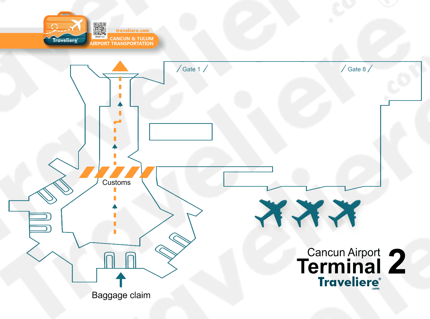 Preview of Cancun Airport Map 2025 from Terminal 2, customs, baggage claim and gates for arrival and departure transportation