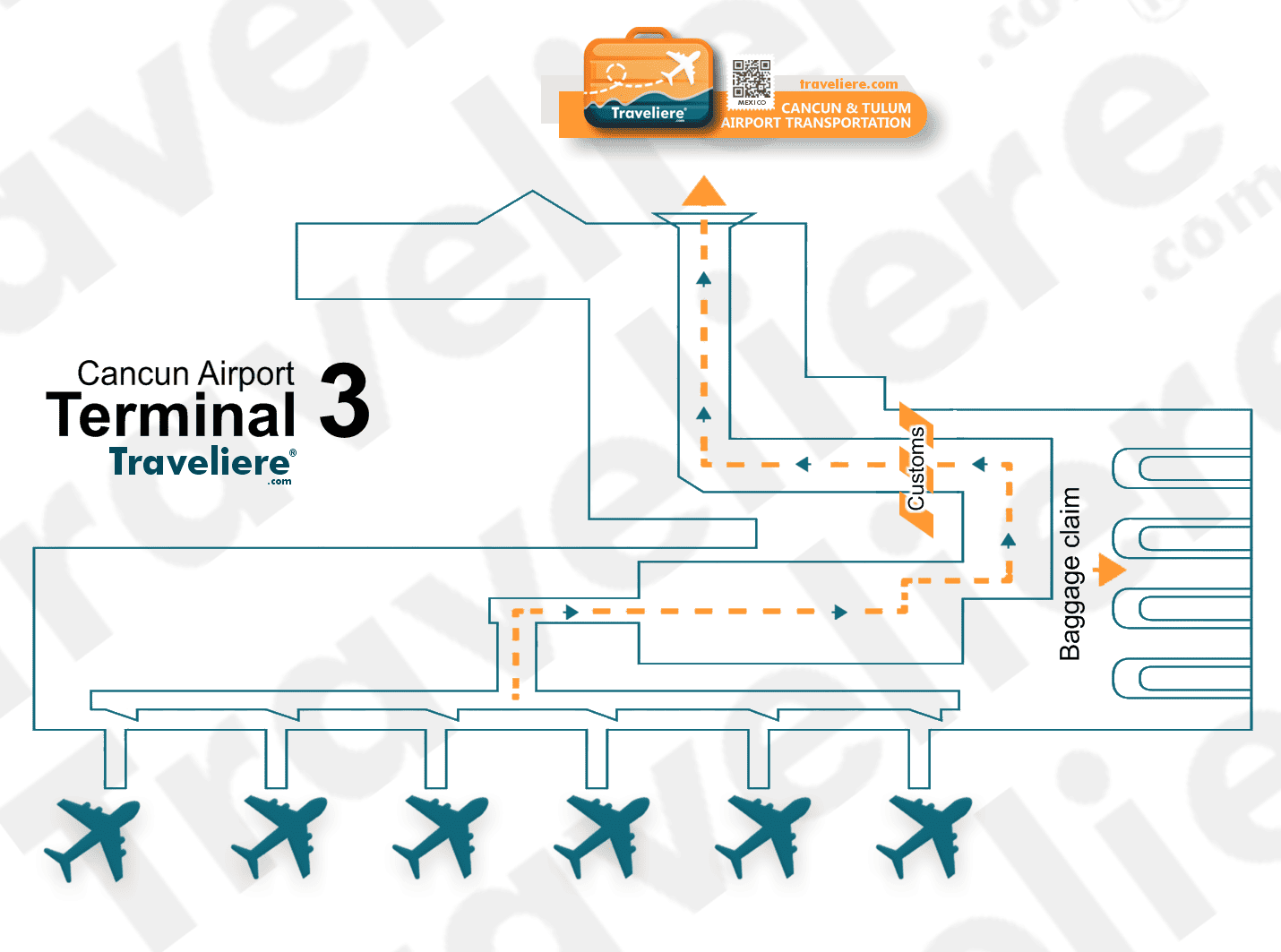 Preview of Cancun Airport Map 2025 from Terminal 3, customs, baggage claim and gates for arrival and departure transportation